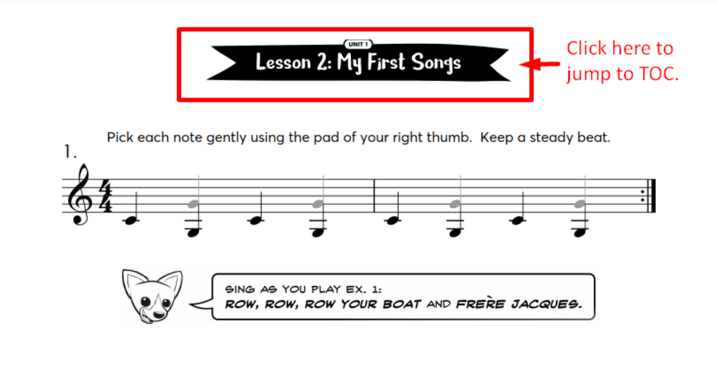 | Version 4.1 of Ukulele in the Classroom fixes a few small typos (probably not enough to warrant re-printing if you've already printed them off), but the main improvement is hyperlinks! That's right, the Table of Contents and all links in the text can now be used to easily navigate the e-books on-screen. ★ Tip: Click any lesson heading to jump back to the Table of Contents: |